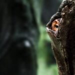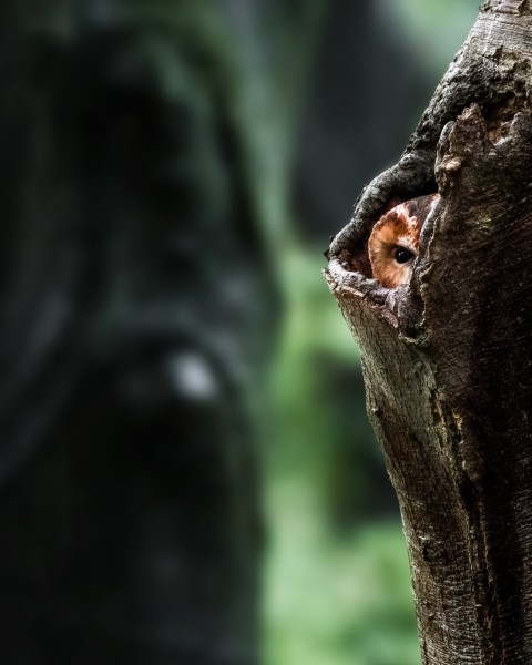 Ook is er een intiem beeld te zien van een bosuil, verscholen in de holte van een oude boom op een grauwe herfstdag. Slechts één oog is zichtbaar, maar de scherpe blik verraadt dat niets aan de uil ontsnapt. Daarnaast toont een krachtig portret van een zwarte specht het spel van licht en donker, met glanzende veren en zelfs regendruppels die nog zichtbaar zijn – een moment van rust en concentratie.